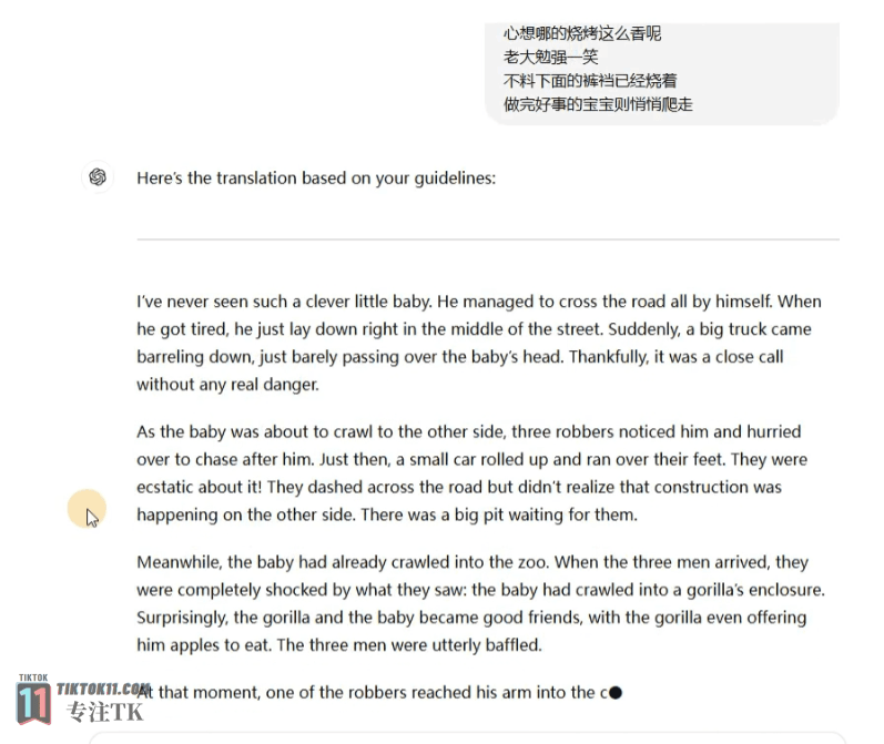 或许你会认为,我们可以直接寻找一个中文解说的内容,然后将相应的语句片段配音成英文并替换原有的中文解说。例如,中文解说“从没见过这么牛的小宝宝”,我们可以将其翻译成英文并配音,然后用它来替换原来的中文解说音段。然而,问题在于不同语言的语速并不相同,通常英语的表达比中文要长,这导致了画面与配音无法完美对应。因此,大多数作品通过加快配音的语速来实现与画面的匹配,这也是为什么你在TIKTOK上看到的一些解说作品,语速快得像连珠炮。