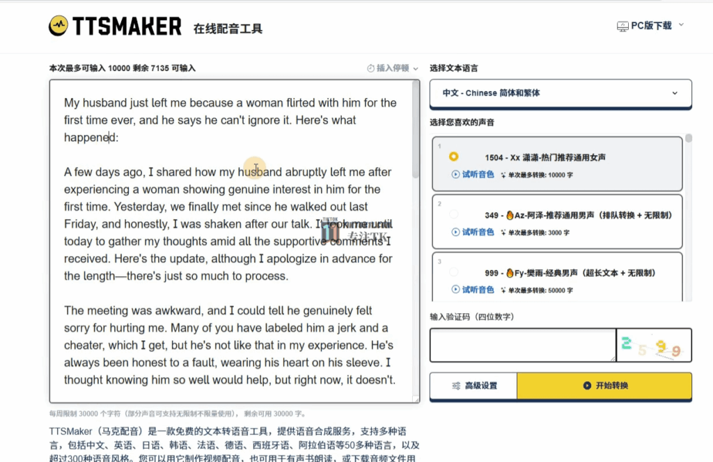 这里的配音的话,大家依然是可以选择自己熟悉的配音方式,这里的操作比较简单,大家可以选择下面这个平台,直接把文案复制进去,一键就可以完成配音了。