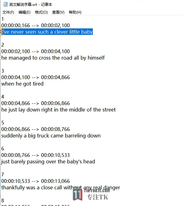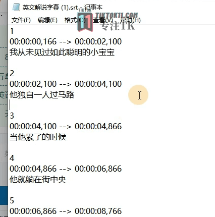 我们把这个配音再次放到剪映里面,同样的识别并且导出字幕,这个时候,我们导出字幕格式为SRT格式。SRT格式是带时间戳的,也就是说这个字幕可以精确的显示每句字幕在哪个位置对应哪句话。