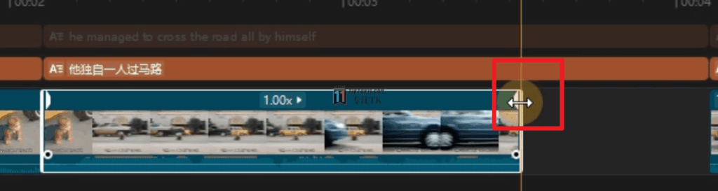 同样的,在剪映里按下ctrl+R,之后光标移动到需要调整的视频片段末尾,出现白色双向箭头以后,向前后拖动,就可以完成匹配了。