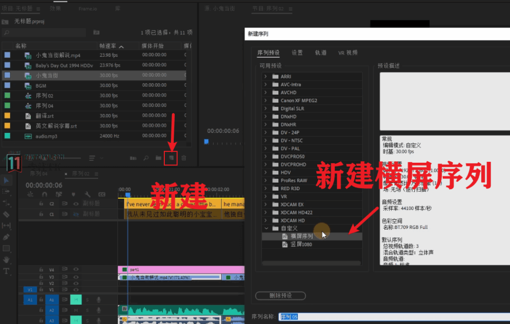 首先我们先新创建一个序列,设置为横屏1920*1080的横屏序列,之后把我们的要剪辑的影视原片拉进去