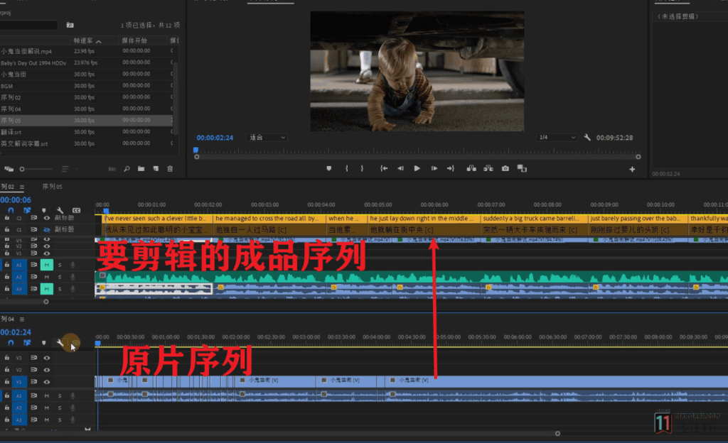 这个时候界面就分为两个任务轨道了。下面的为原片序列,上面的是我们要剪辑的成品作品序列。我们先看上面序列的字幕轨道里需要什么样的画面,这个时候,就可以在下方原片里找到对应的画面,直接裁剪了往上拖。